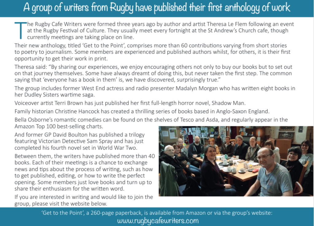 The feature includes a picture of some of the writers – meeting in St Andrew’s Church, Rugby – and a description of our new book, Get to the Point. The anthology was published earlier this year and includes a varied selection of short stories, journalism and poetry by our talented members.