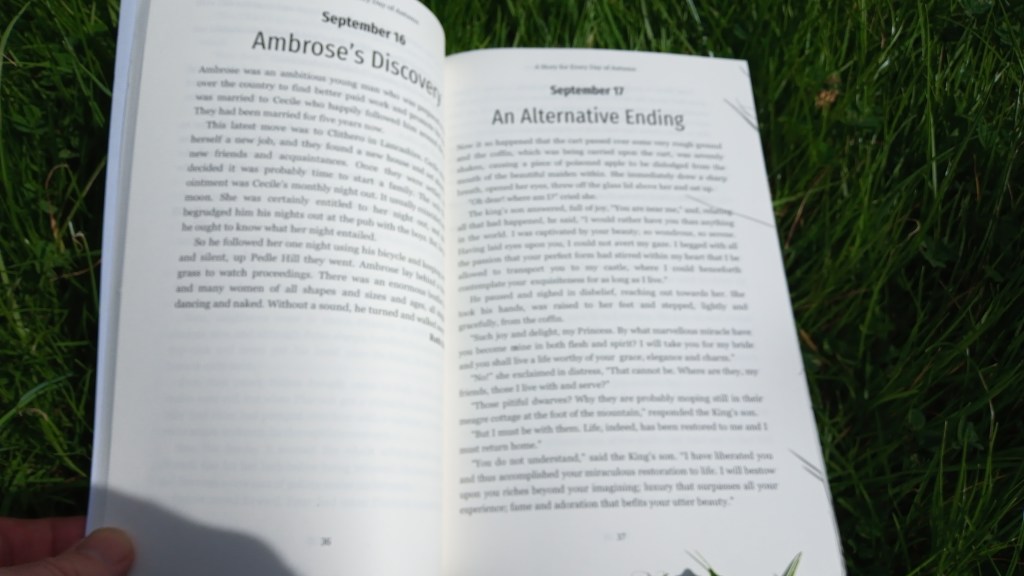 The book is an anthology of stories – one for each day of September, October and November. Some are fiction, some are memoir and many suit the season, with tales of Autumn, spooky stories for Hallowe’en and dramatic stories for Fireworks’ Night. Most of the stories can be read in just a few minutes.